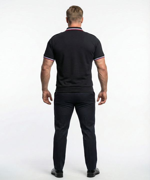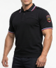 Футболка ПОЛО МВД нового образца (приказ 777), выполнена из трикотажного пике качества "компакт пенье". Из-за высокого содержания хлопка (95%) ткань является "дышащей" (в отличии от синтетических аналогов), а добавление лайкры 5% не позволяет изделию выцветать и растягивается во время эксплуатации и после стирок. Футболка прямого силуэта с втачными рукавами. Горловина на стойке с втачным вязанным воротником с Российским триколором. Перед и спинка цельнокроеная. В левой половине нагрудный карман на молнии и петля для крепления жетона. На плечах шлевки на пуговицах для крепления фальш погон. Рукава обработаны вязанным подвязом (манжетом) с Российским Триколором. Низ футболки обработан подвязом в цвет изделия.